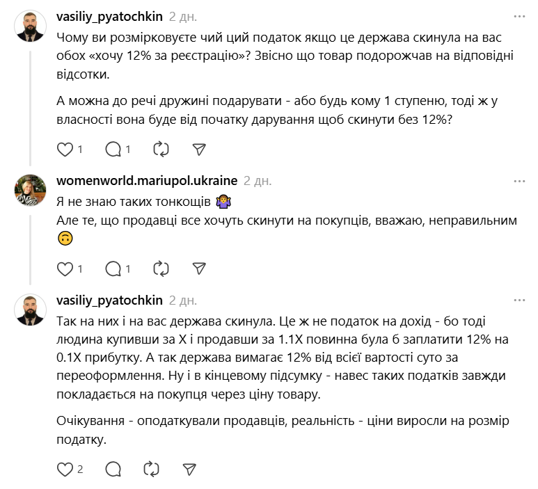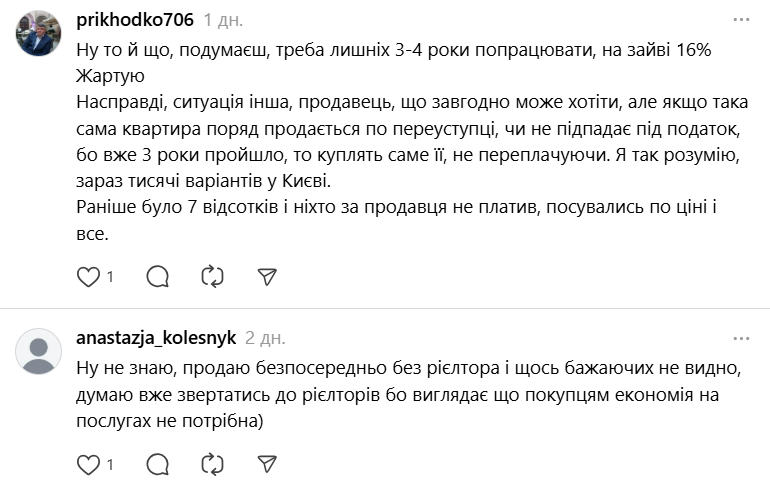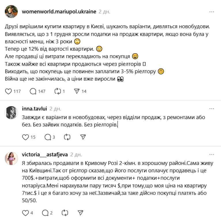 "З 1 грудня зросли податки на продаж квартири, якщо вона була у власності менш, ніж 3 роки. Тепер це 12% від вартості. Але продавці ці витрати перекладають на покупця. Також майже всі квартири продаються через ріелторів. Виходить, що покупець ще повинен заплатити 3-5% ріелтору", — констатувала користувачка соціальної мережі Threads.