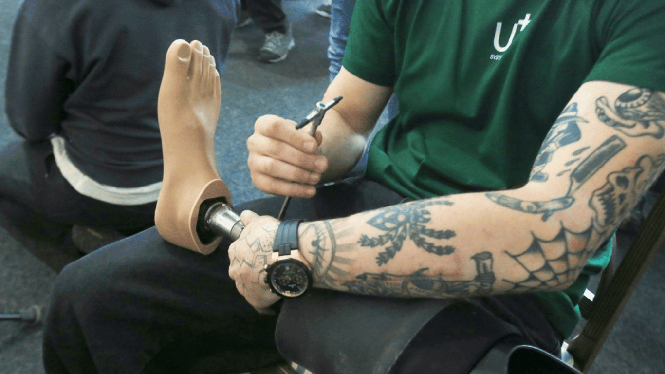 Людині з інвалідністю налагоджують протез. Фото: УНІАН