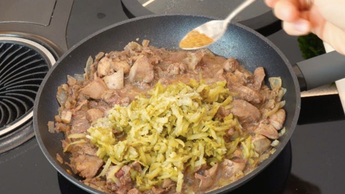 Meanwhile, finely chop the onion and grate the cucumbers on a coarse grater. Heat oil in a frying pan and fry the onion until golden brown. Drain the liver and add it to the onions. Cook over medium heat, covered, for 3-4 minutes.