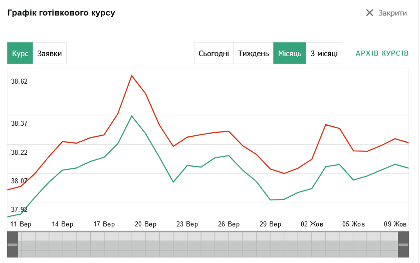 Національний банк України (НБУ) встановив офіційний курс валют на 10 жовтня. Відповідно до нього, євро коштує 38,48 грн/євро (-0,17), а долар — 36,55 грн (-0,03).