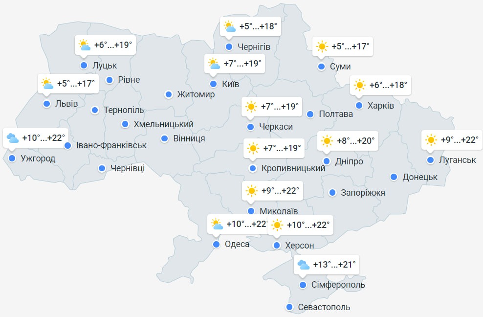 Температура повітря вночі +4-9°, у південній, південно-східній частинах та на Закарпатті +9-14°. Вдень очікується +17-22°, а на півдні та Закарпатті до +25°.