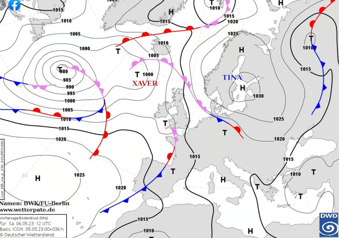 Проте більша частина України вихідними потрапить у суху погоду (антициклон Tina на карті), невеликі дощі можливі лише в Приазов'ї і місцями в західних областях.
