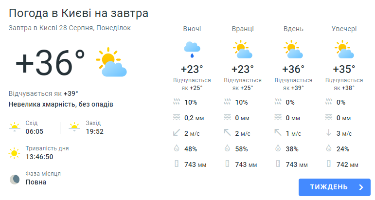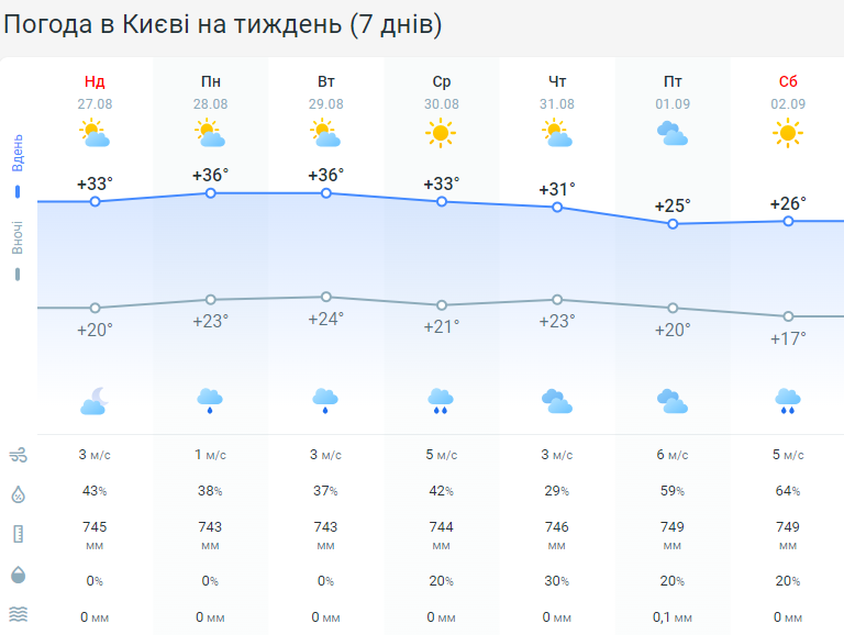 у Києві вночі +20+22°С, вдень +33+35°С.