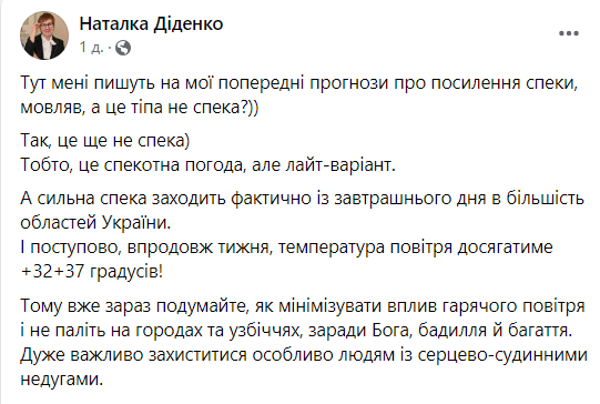 "Найспекотнішими будуть із початку тижня південь, центр та північ України, +33+37 градусів. На заході та сході очікується +26+30 градусів. Послаблення сильної спеки — орієнтовно з четверга", — написала народна синоптикиня Наталка Діденко.
