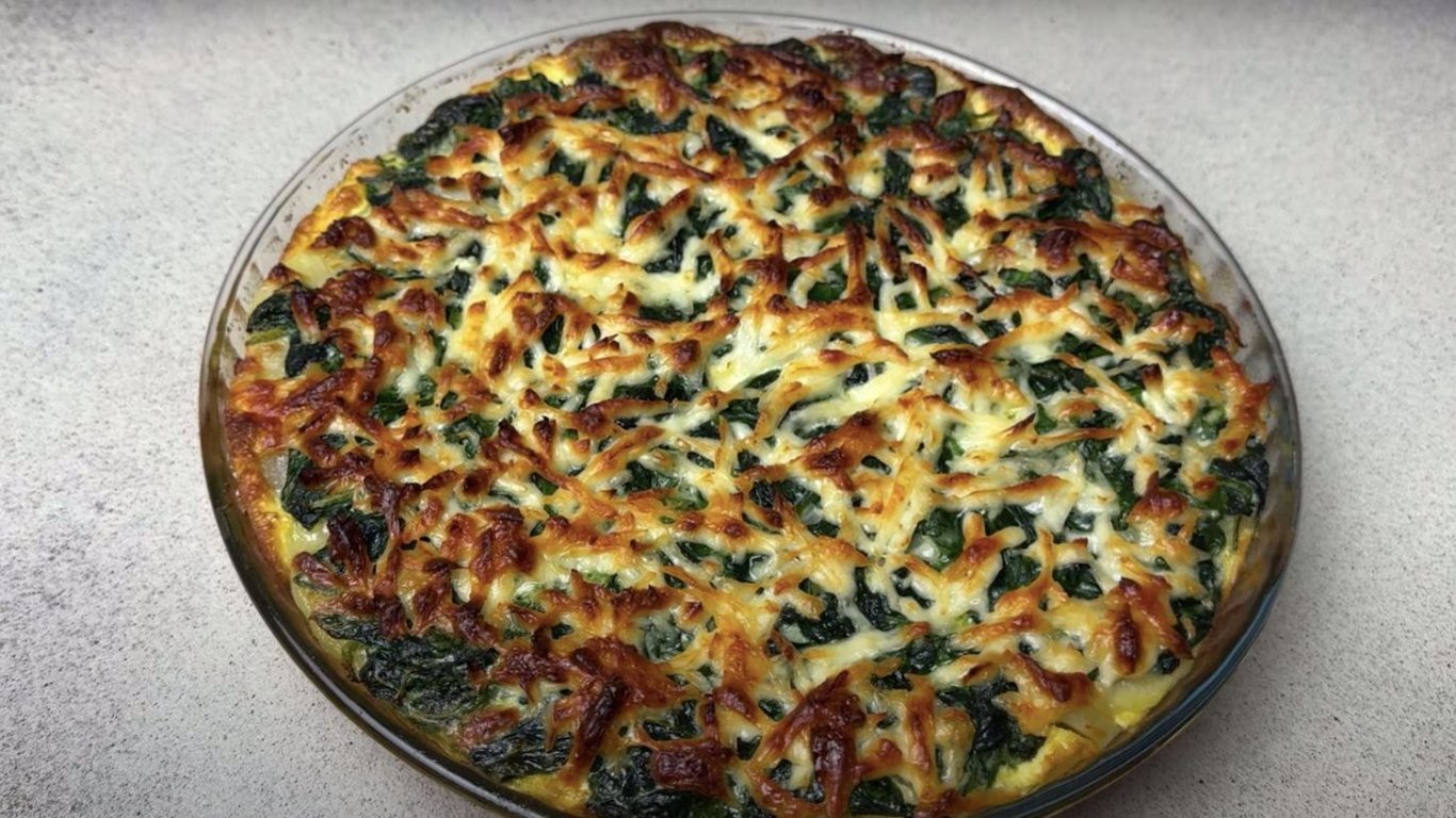 Форму діаметром 30 см змастити вершковим маслом. Викласти на дно картоплю. Залити яєчно-вершковою масою зі шпинатом, рівномірно розподіляючи її по поверхні. Бринзу натерти на великій тертці та посипати зверху.
