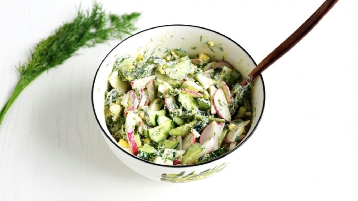 Подавайте одразу або зберігайте нарізані інгредієнти без заправки в холодильнику, а перед подачею додайте сметану, сіль і перець. Так салат залишиться хрустким та свіжим.