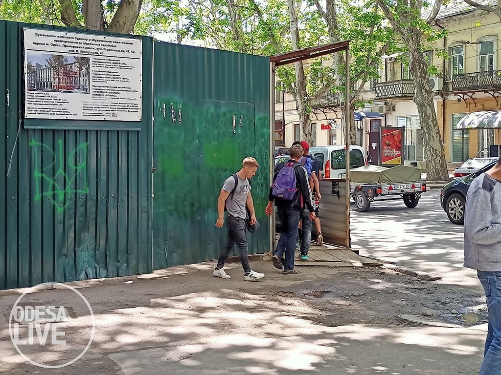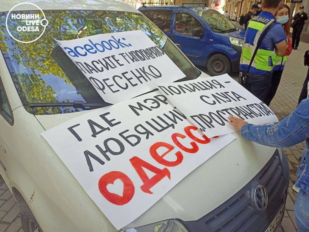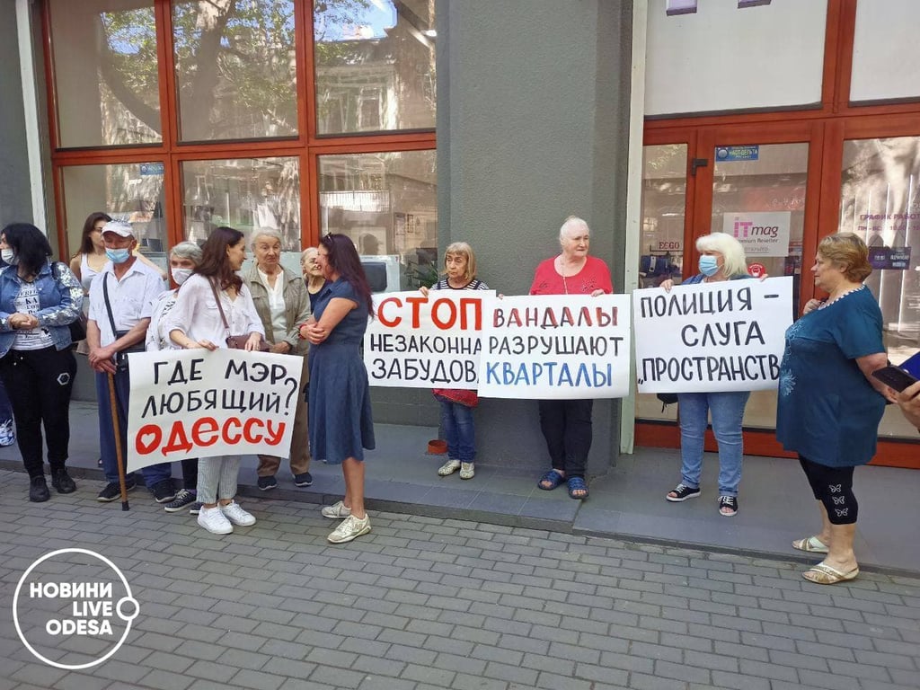 Одесситы собрались под “законно установленным” забором и демонстрировали плакаты с надписями: “Спасем историю Одессы”, “Спасите наши жизни, чиновники бездействуют”, “Вандалы рушат кварталы” и “Где мэр любящий Одессу?”. Параллельно с этим, на место начали прибывать полицейские. Впрочем, не для активного взаимодействия с митингующими, а для их контроля.