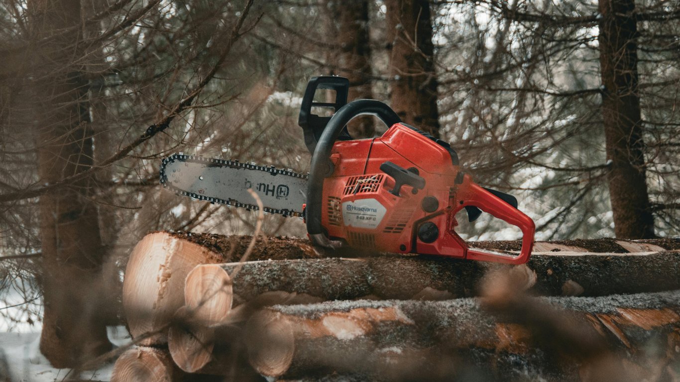 Бензопила лежит на срезанных деревьях. Фото: Pexels
