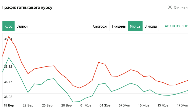 На наличном рынке американская валюта в среднем стоит 38,10 грн (+0,00). В покупке — 37,41 грн (+0,06), в продаже — 38,12 (+0,03). Евро стоит в покупке 39,56 грн (-0,07), в продаже — 40,59 (-0,12) грн.