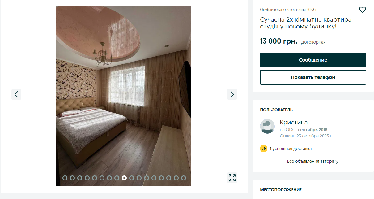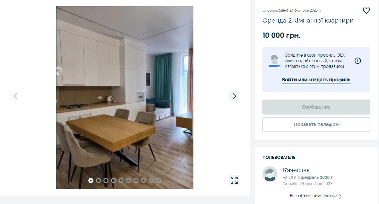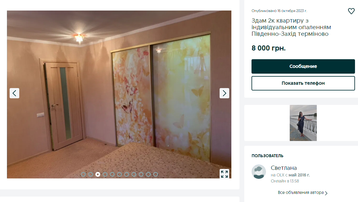 Скриншот объявления об аренде светлой и современной квартиры. Источник: OLX