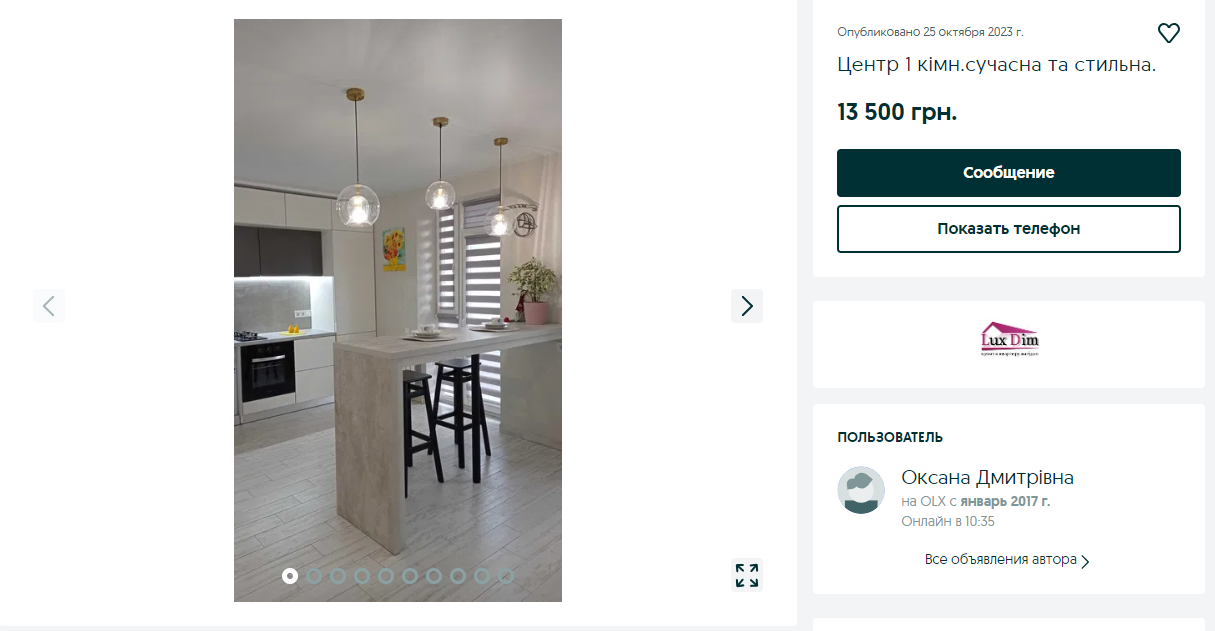 Скриншот объявления об аренде светлой и современной и стильной квартиры. Источник: OLX