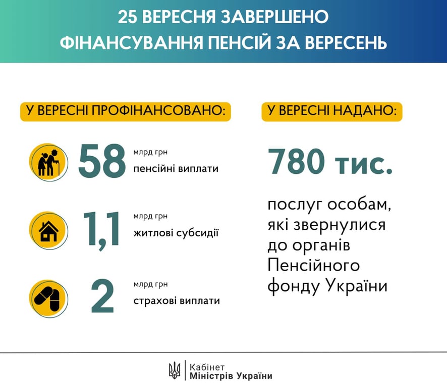 "25 сентября завершено финансирование пенсий за сентябрь. На выплаты направлено 58,3 млрд грн", — говорится в сообщении.