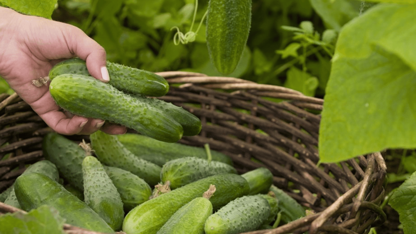 Дачница, которая собирает урожай огурцов на огороде. Фото: Pinterest