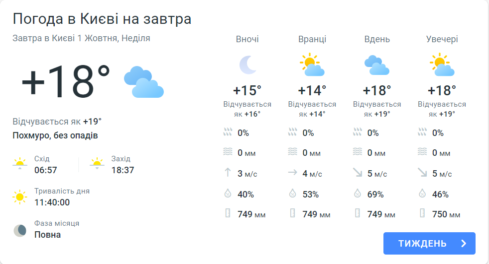 Прогноз погоды в Киеве сегодня, 1 октября, от Meteoprog