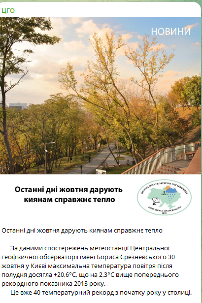 "Конец октября оказался удивительно теплым для жителей Киева. По данным ЦГО, 30 октября максимальная температура воздуха в городе достигла +20,6°С, что на 2,3°С выше рекорда, зафиксированного в 2013 году", — сообщили в пресс-службе.