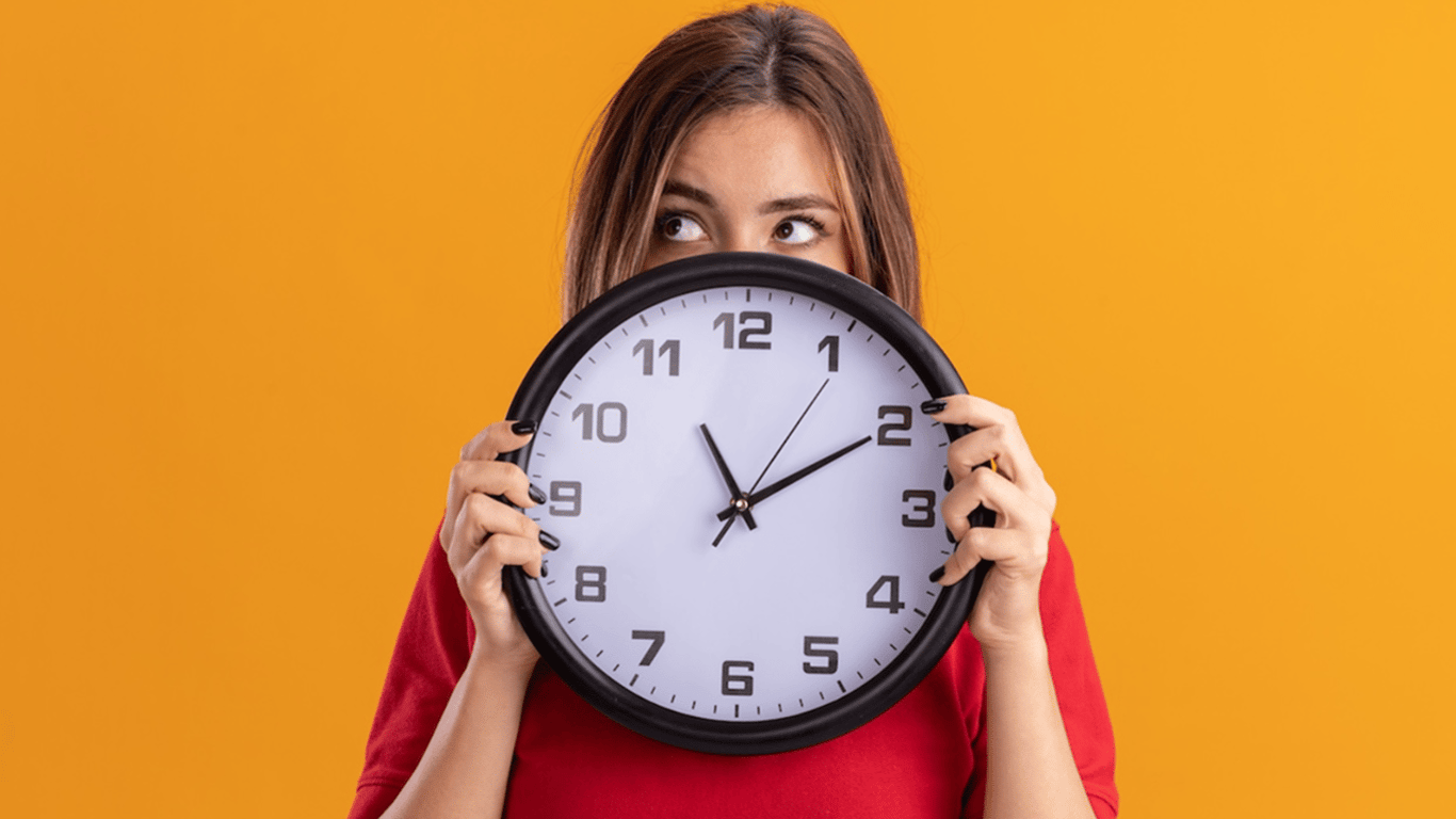 Молодая девушка, которая держит настенные часы. Фото: Freepik