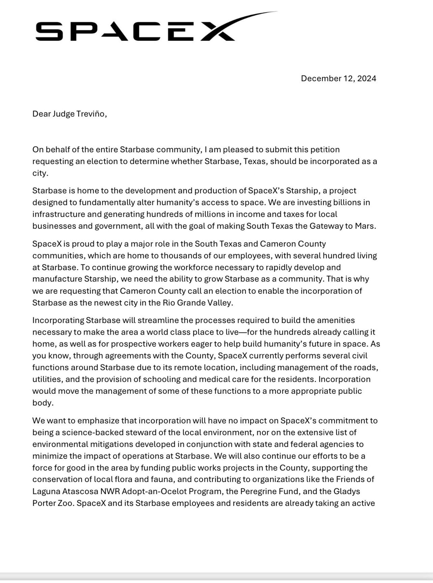 "Для продолжения развития необходимых рабочих ресурсов мы нуждаемся в возможности расширять Starbase как сообщество. Именно поэтому мы просим округ Кэмерон провести выборы для предоставления Starbase статуса города в Рио-Гранде-Велли", —написала Кэтрин Людерс в письме судье округа.