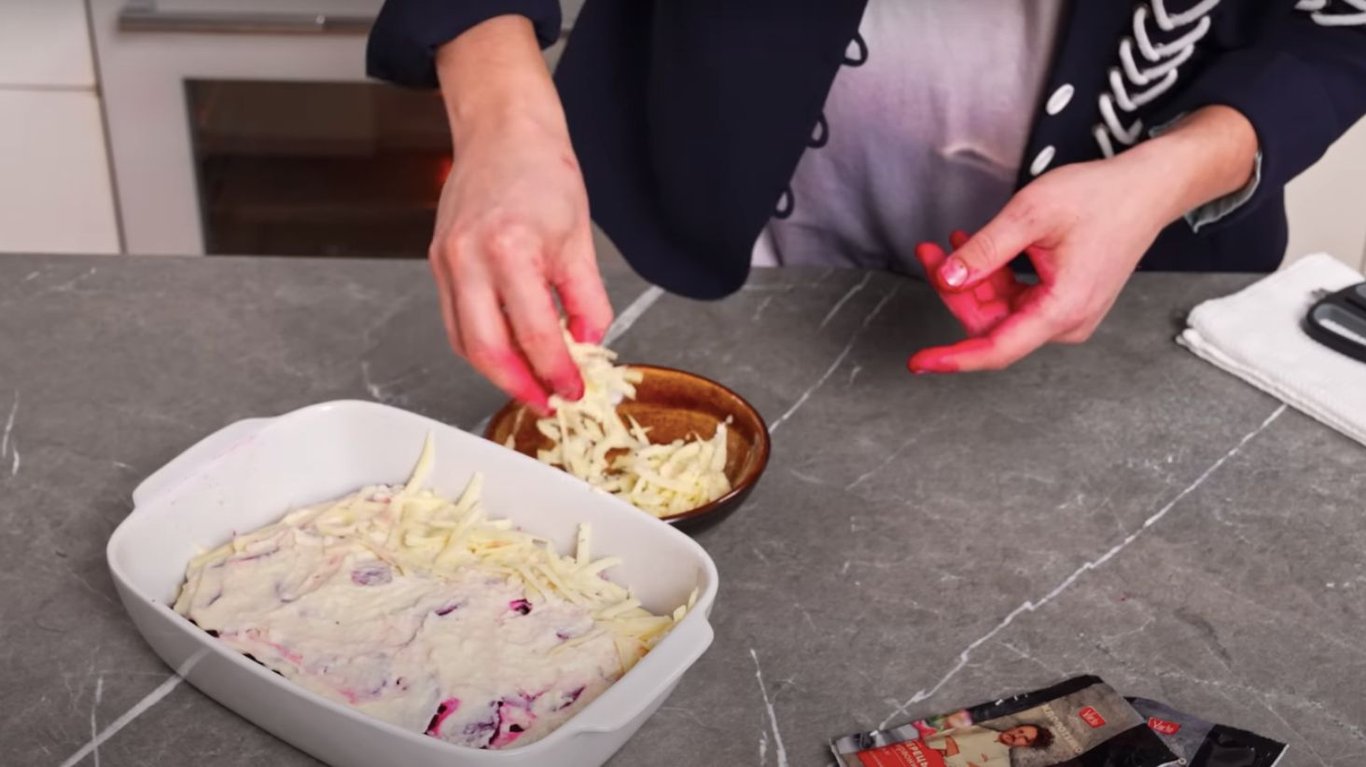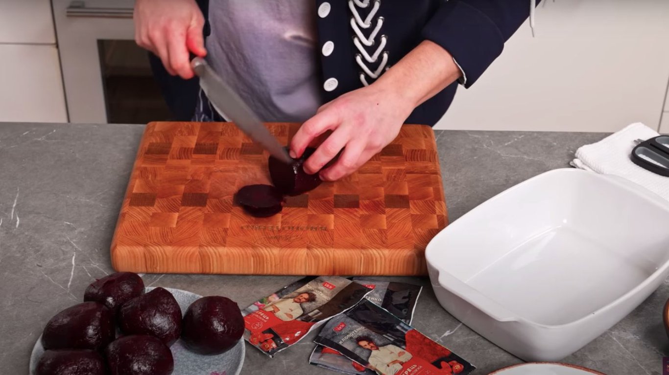 Шеф-повар Евгений Клопотенко предложил приготовить гратен, но не классический, с картофелем, а из свеклы на украинский лад. Блюдо дополняется соусом бешамель и сыром.