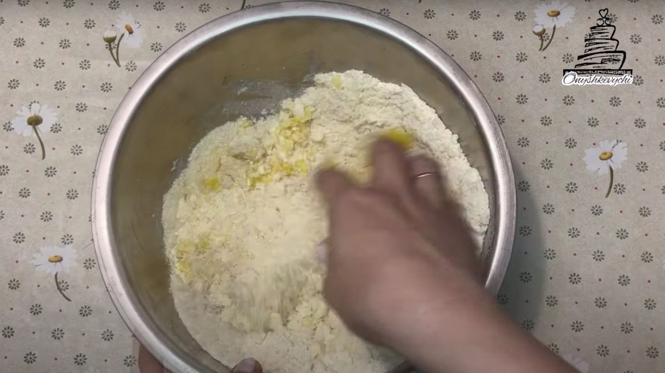 Сначала нужно приготовить тесто. К муке натираем сливочное масло из холодильника.