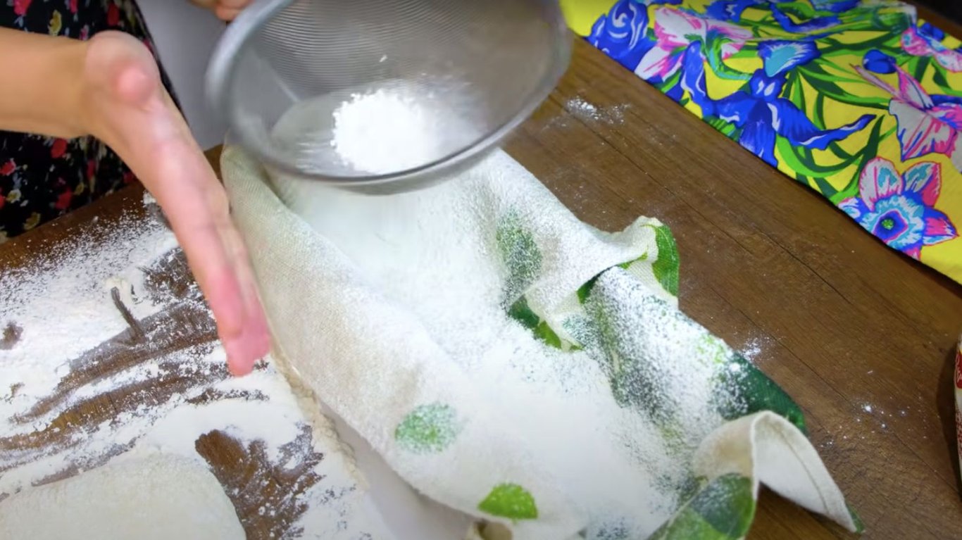 Мука на полотенце. Фото: YouTube @AlinaFooDee