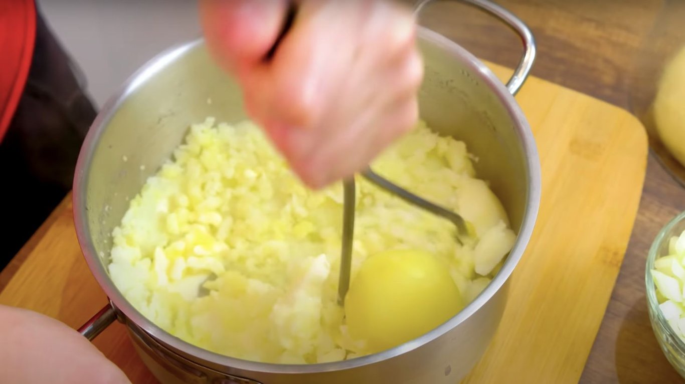 Картофель отварим в подсоленной воде до готовности. Добавим сливочное масло, хорошо разминаем толкушкой до однородности. Даем начинке полностью остыть. В картофель по желанию можно добавить обжаренный лук, сало, грибы и т.д., уменьшив при этом количество картофеля, чтобы общее количество начинки было около 500 гр.