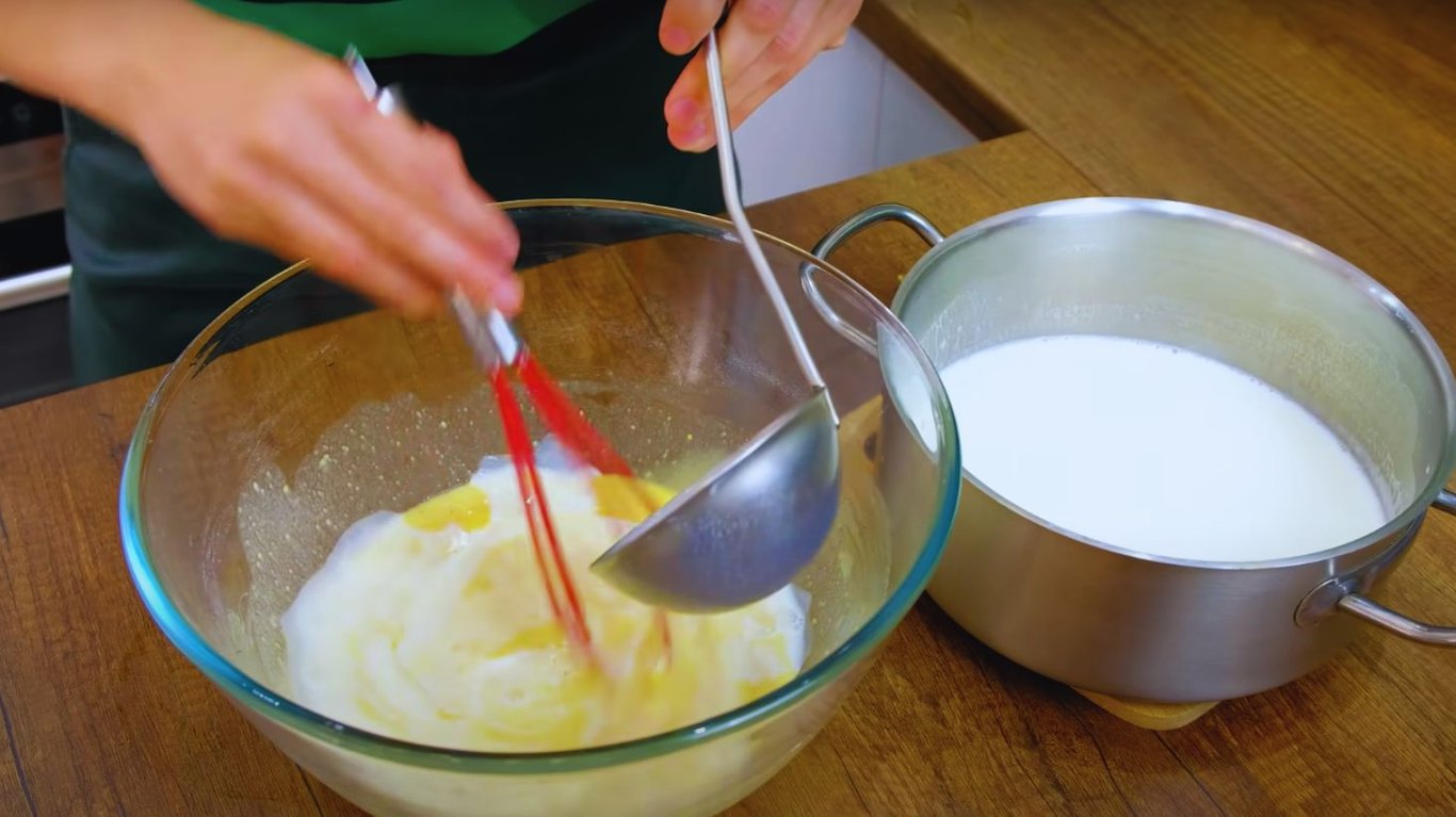 Далее нужно частями добавить горячее молоко в яично-мучную смесь, постоянно перемешивая.