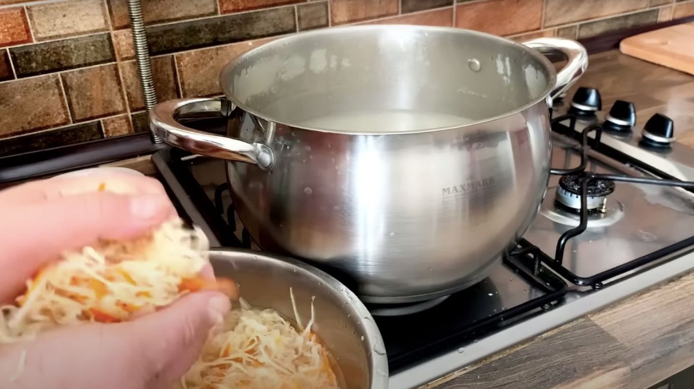 Затем добавляем промытую квашеную капусту в бульон. Если вы не любите слишком кислый капустняк, тогда капусту нужно промыть несколько раз. Добавить лавровый лист и душистый перец.