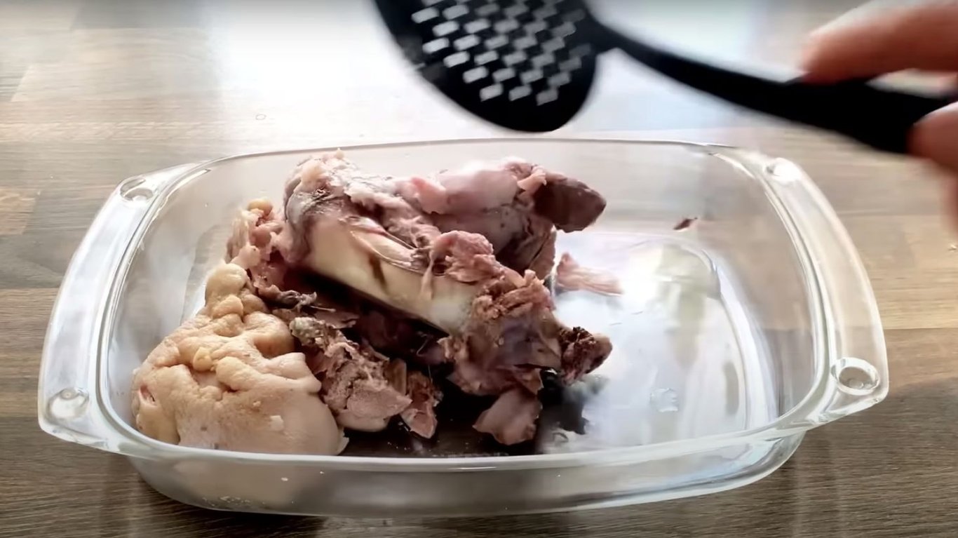 Сначала нужно сварить бульон из свиной рульки. Достать ее и дать остыть.