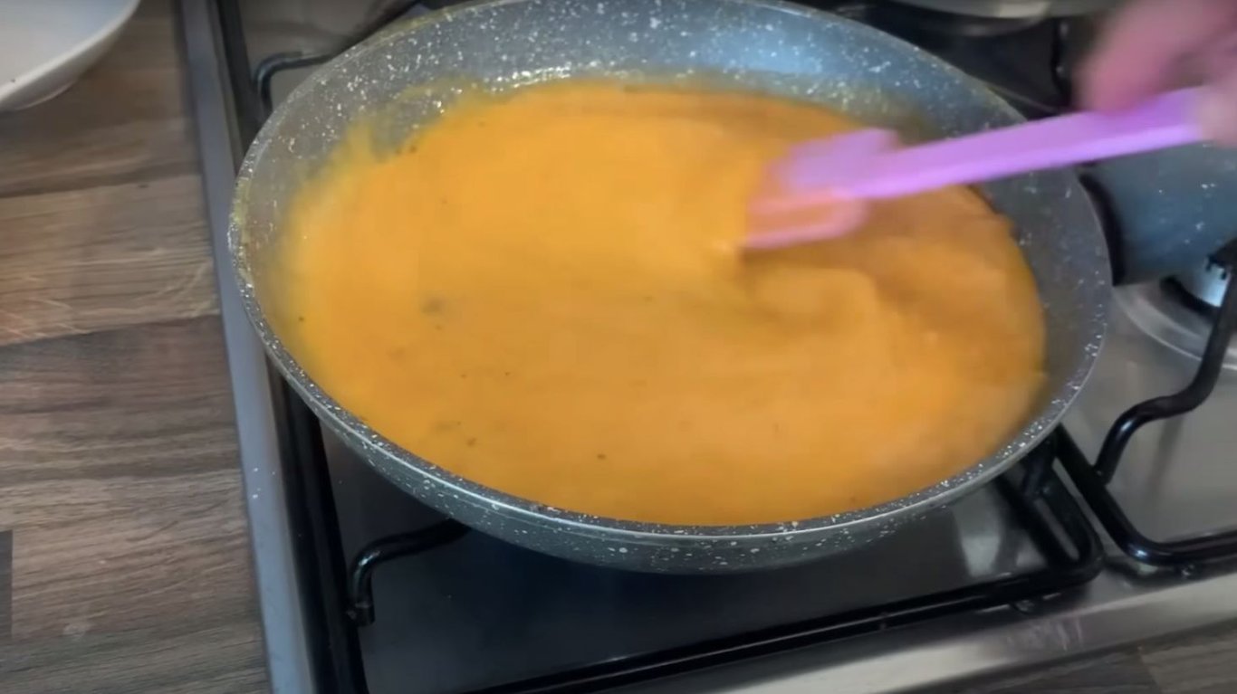 Теперь на сковороду нужно добавить сливочное масло и 1 столовую ложку муки, жарить до карамельного цвета. Затем добавляем немного томатной пасты и жидкости из кастрюли.