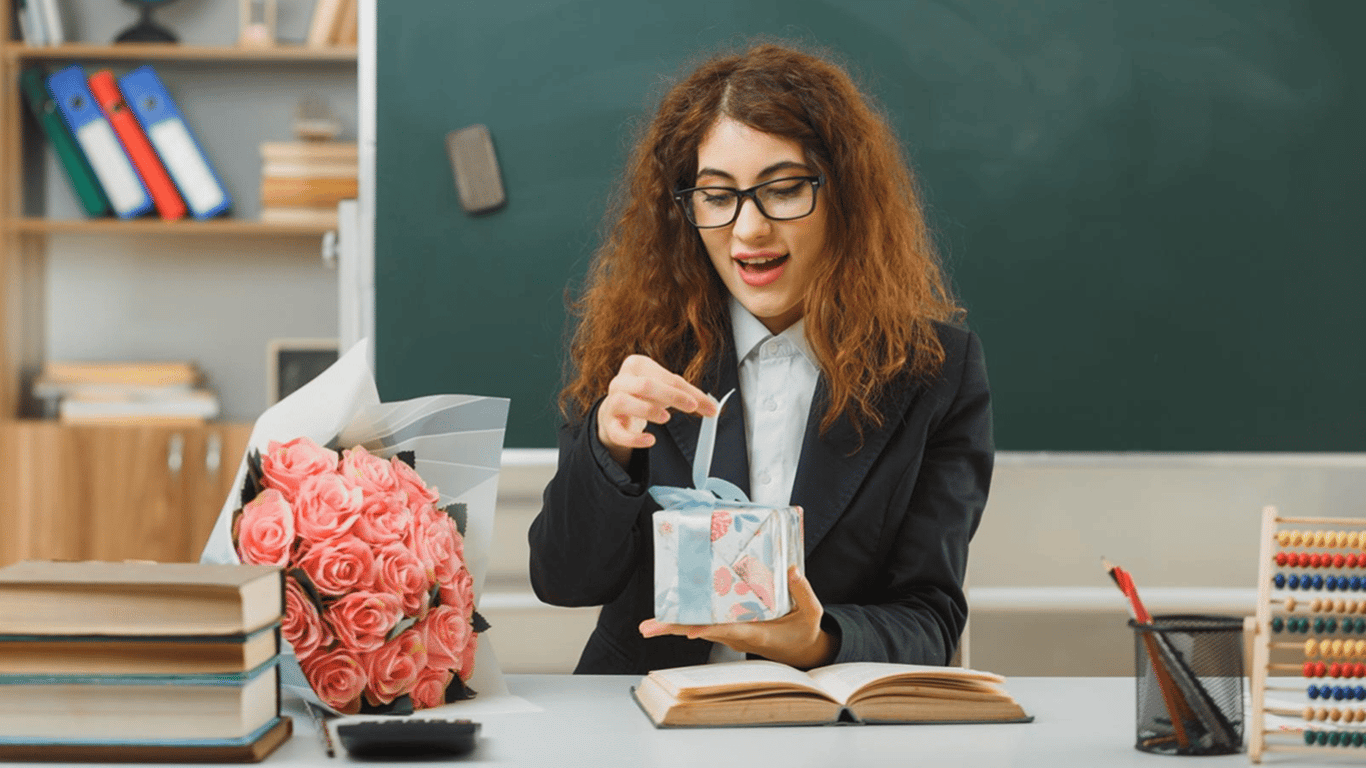 Молода вчителька, яка розкриває подарунок у класі. Фото: Freepik