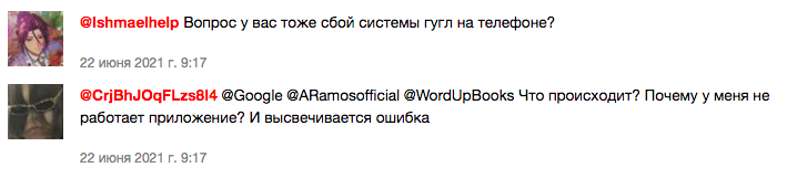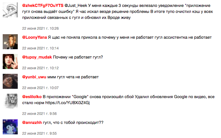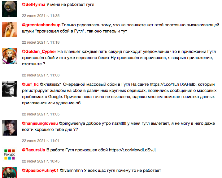 Останній раз масовий збій в компанії Google стався 23 березня 2021 року. Тоді проблеми почалися після півночі і скарги надходили від користувачів з Росії, Нідерландів, Німеччини, Бельгії, Великобританії, Франції, США та інших країн. Більшість користувачів (68 %) зазнали труднощів із завантаженням сайту, а приблизно третина (31 %) не могли увійти під своїм обліковим записом.