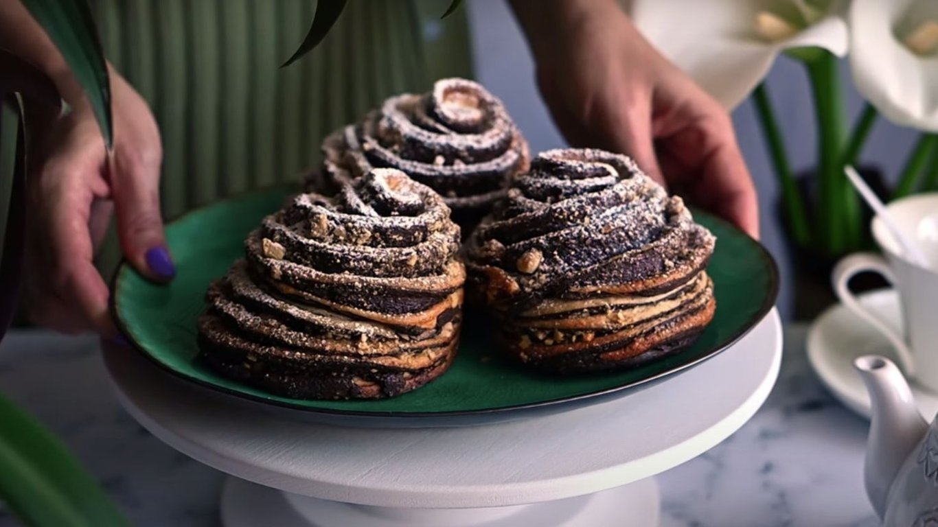 Рулет розрізати вздовж посередині. Скрутити тісто, щоб шари були зовні. Для булочки середнього розміру рулет не розрізаємо до кінця і скручуємо крафін з усього тіста, накладаючи один шар поверх іншого.