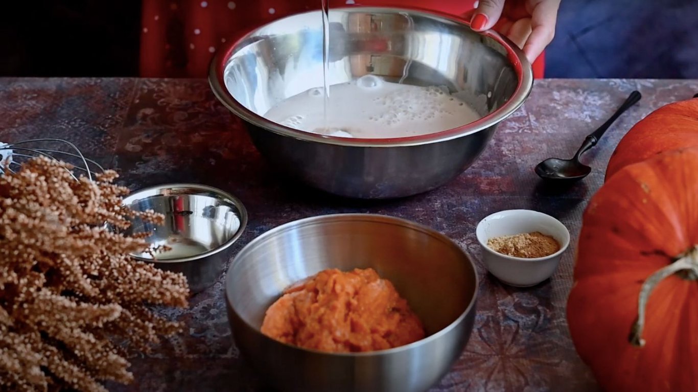 У великій мисці змішати опару з олією, цукром, медом і гарбузовим пюре (в ідеалі гарбуз запекти і збити блендером).