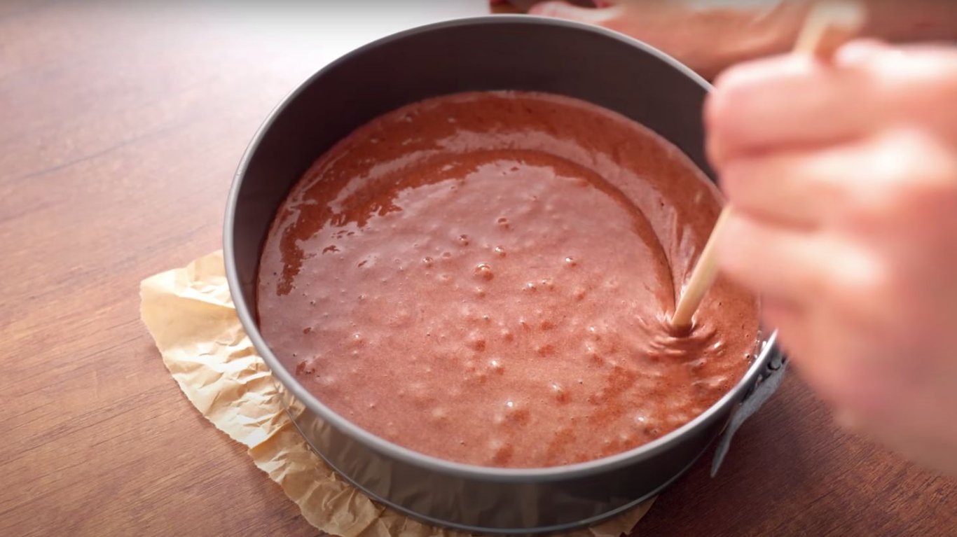 Вистелити дно форми для випікання пергаментом. Вилити тісто. Вдарити формою об стіл кілька разів, щоб усередині не було повітря. Прокрутити форму, щоб тісто не піднімалося гіркою під час випікання.