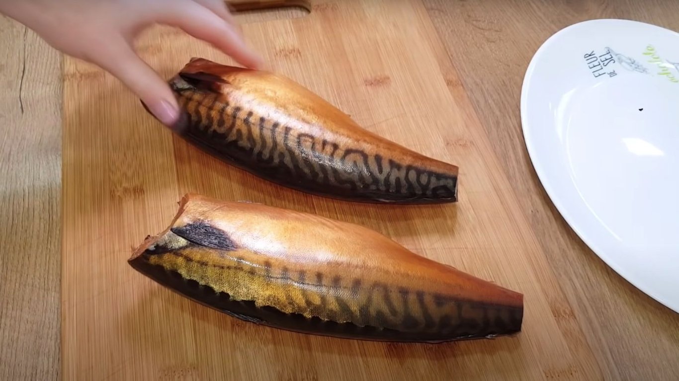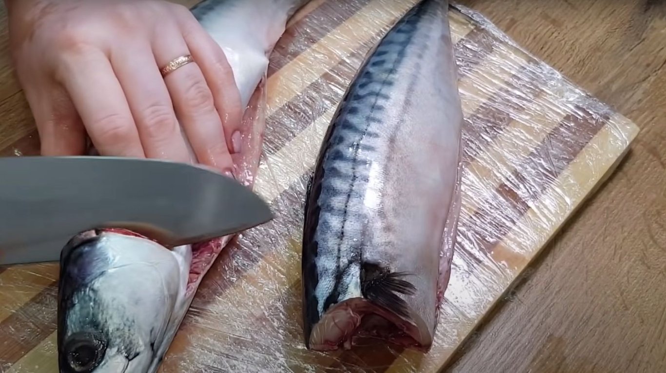 Тепер потрібно очистити свіжу скумбрію, щоб не залишилося темних плівок, та відрізати голову.