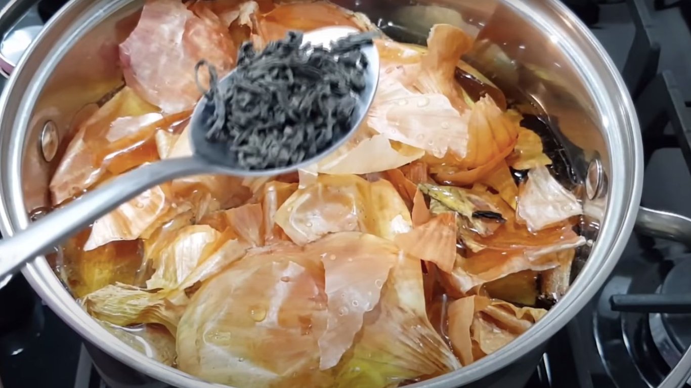 Спершу необхідно приготувати маринад. Для цього кладемо в каструлю з водою велику жменю лушпиння цибулі, чорний сухий чай, цукор і сіль. За бажанням можна ще додати запашний перець та коріандр. Маринад потрібно варити 10 хвилин.