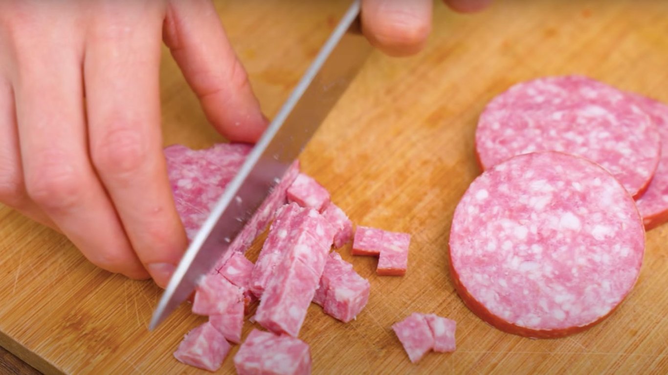 Спочатку необхідно нарізати дрібним кубиком ковбасу.