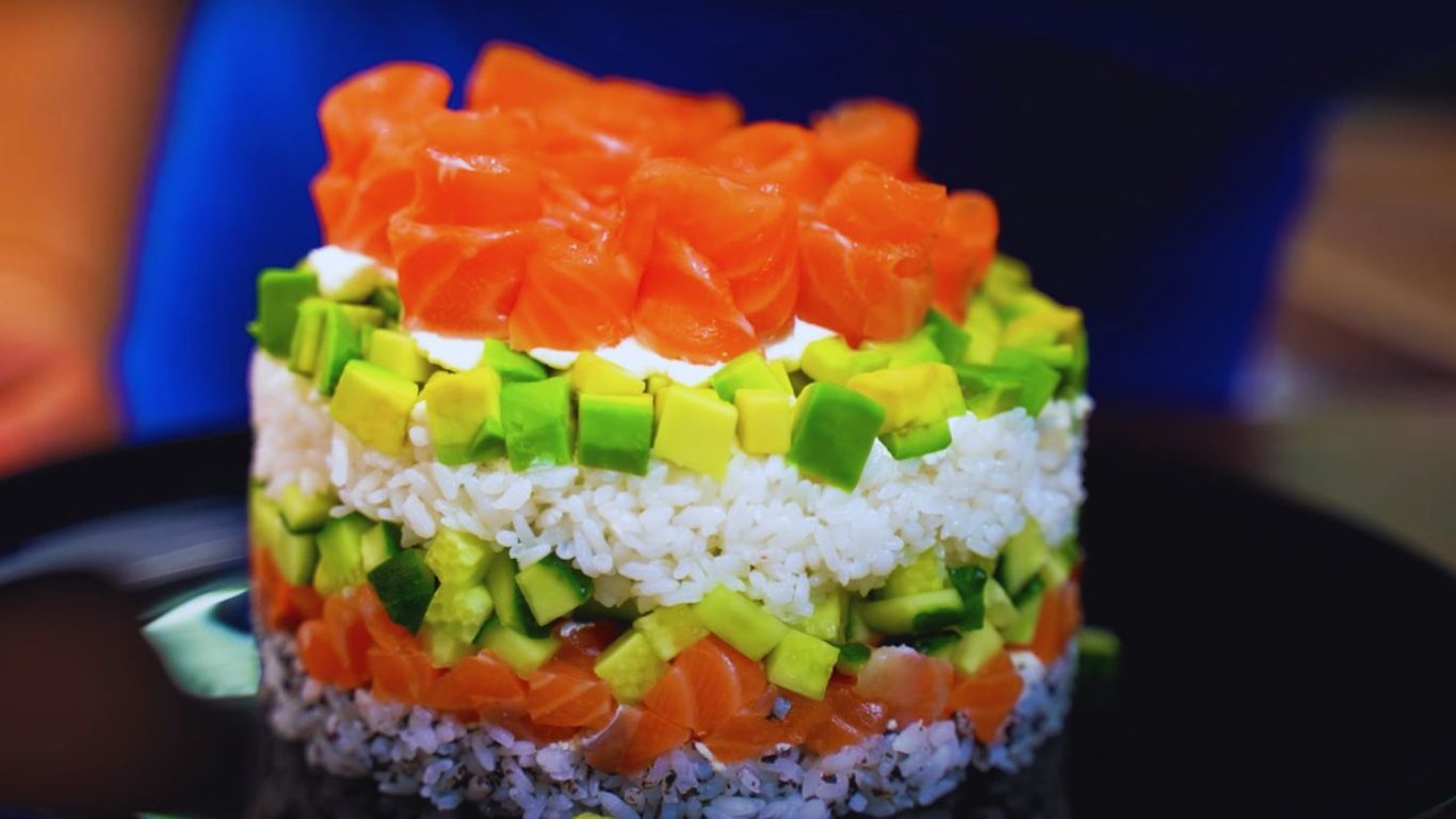 Збираємо салат: перший шар рис із норі, потім — червона риба кубиками, огірок, рис, авокадо, червона риба слайсами у формі троянд.