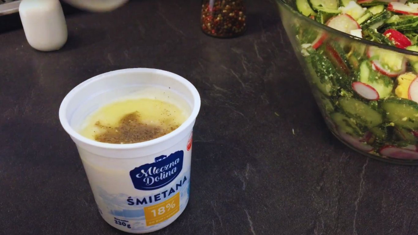 Далі приготуємо заправку, до сметани додаємо сік лимона, сіль та спеції.