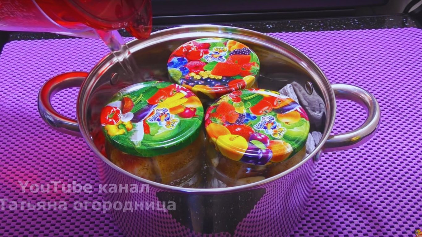 Ставимо на плиту та після закипання стерилізуємо під закритою кришкою на повільному вогні 45 хвилин.
