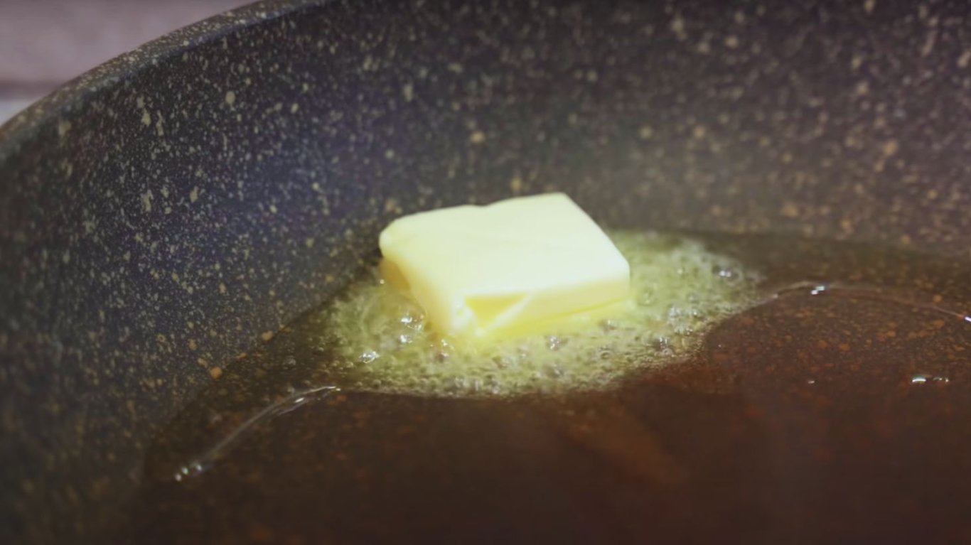Наливаємо на сковороду трохи рослинної олії та додаємо маленький шматочок вершкового масла.