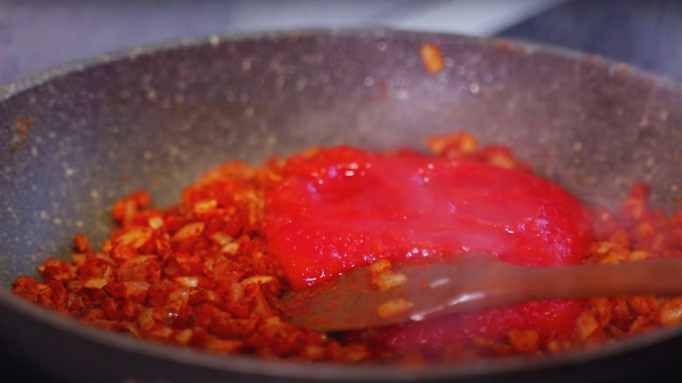 Цибуля, паприка та томатне пюре. Фото: YouTube @AlinaFooDee
