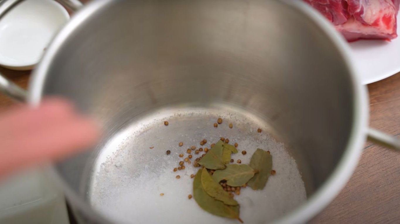 У воду додати сіль, цукор, коріандр, лавровий лист, запашний та чорний перець, гвоздику. Поставити на вогонь та дати покипіти 5-10 хвилин.